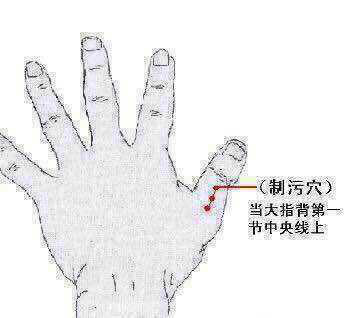 制污穴在拇指背面、两个骨节之间的竖向青筋上。当看不到青筋时,就是中央的一条先上。